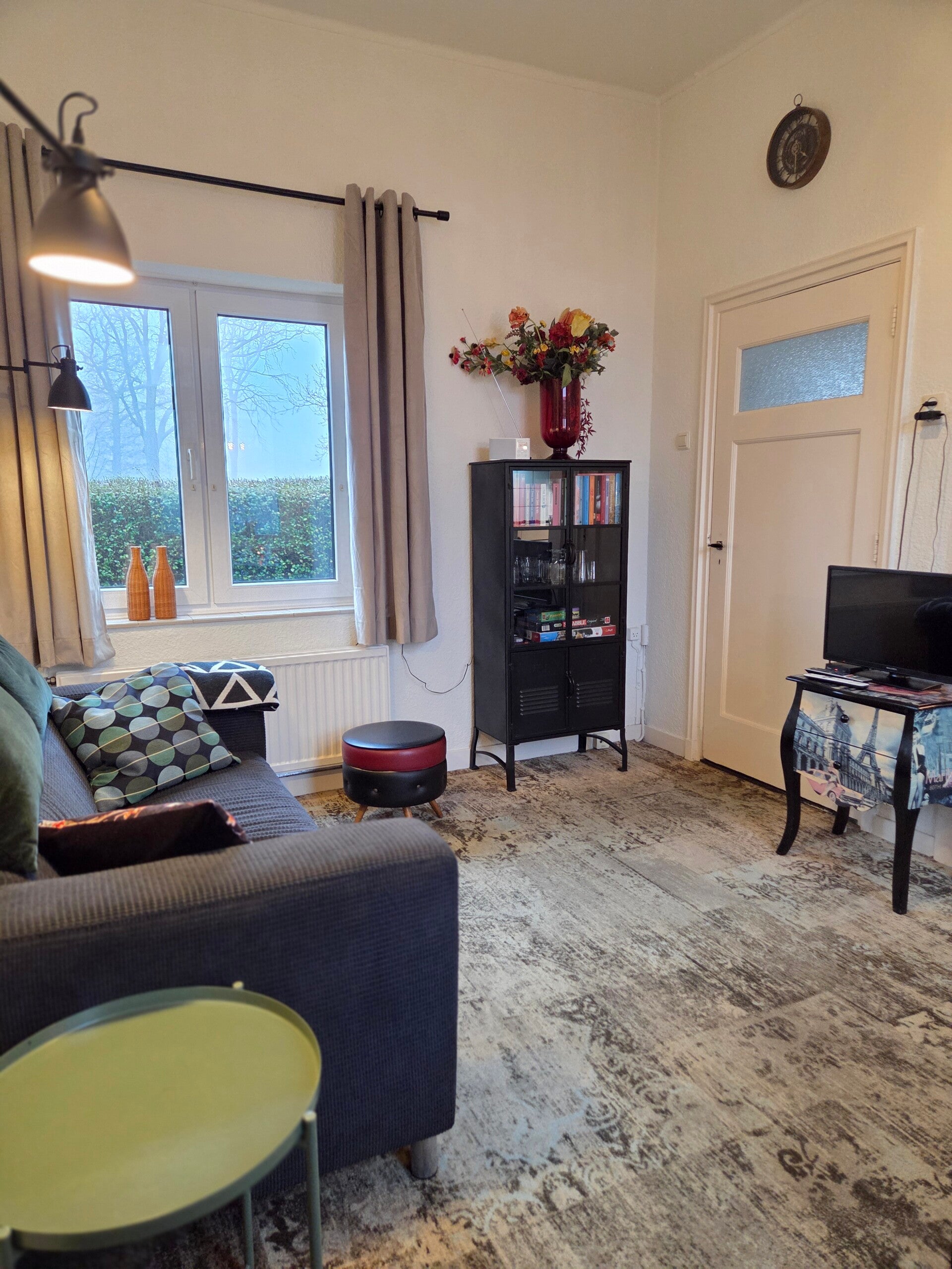 De gezellige woonkamer heeft een lekkere bank, eettafel, smart TV, radio, boeken/leesvoer, een paar spelletjes, leeslampjes en een open keuken met een koelkast, magnetron, 4-pits kookstel, potten, pannen, servies, bestek, senseo- en filterkoffiezetapparaat, waterkoker, handvoorraad koffie, thee, e.d.. De badkamer is v.v. een instap-regendouche met een wastafel.